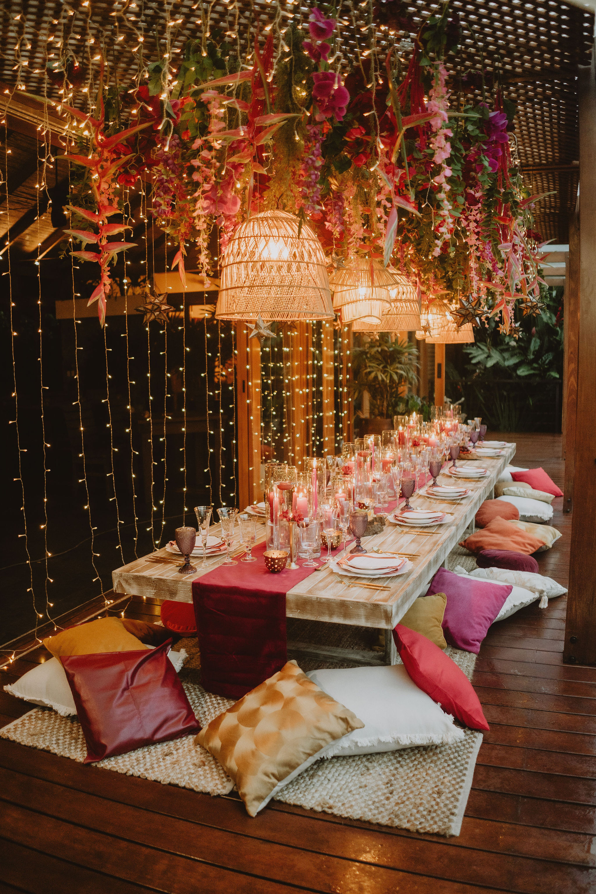 The wedding ceremony, designed by One Heart, took place deep within the jungle. At the heart of this natural sanctuary was a floral mandala rug, composed of hundreds of blooming flowers, and set beneath hanging floral curtains and rattan lanterns. This beautiful setup created an intimate and surreal atmosphere, perfect for celebrating love amidst nature.